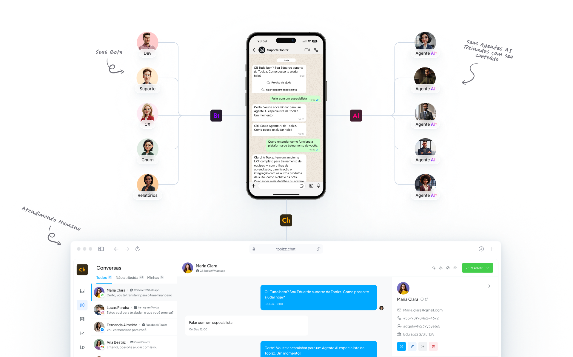 Toolzz · inteligência artificial para empresas · chatbot no-code · agente de voz IA · plataforma omnichannel · LXP educação corporativa · automação atendimento · WhatsApp bot · IA para negócios · SaaS brasileiro